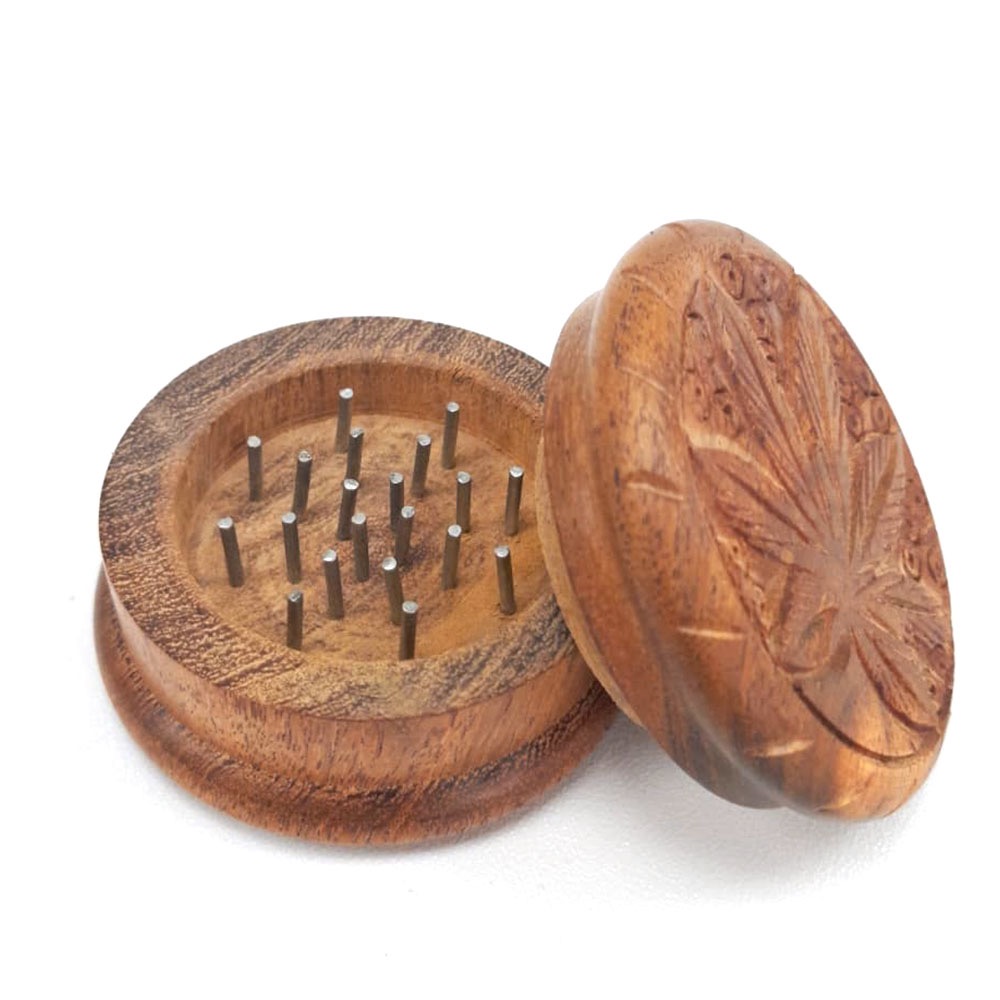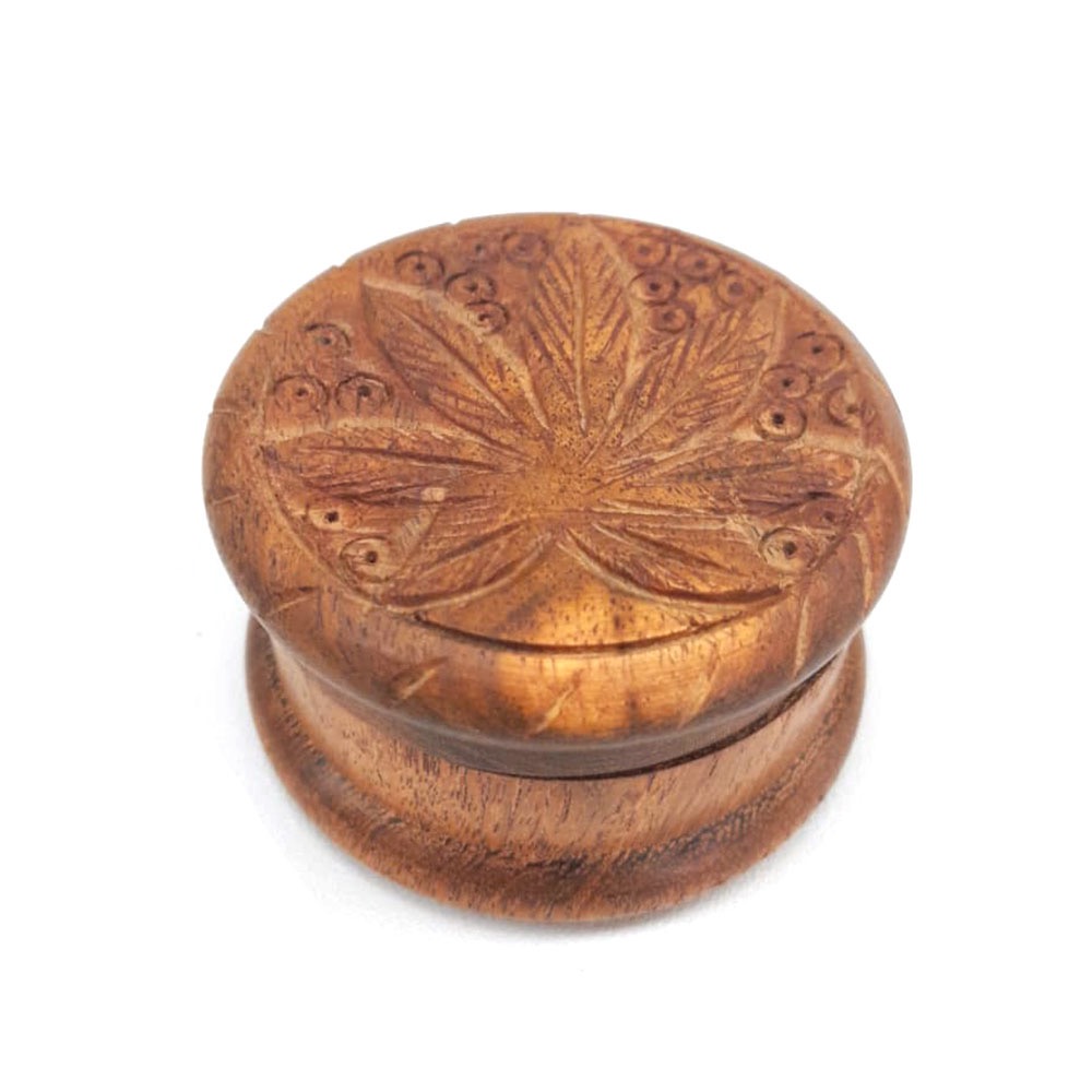 Grinder de madera con una hoja tallada en la parte superior.
