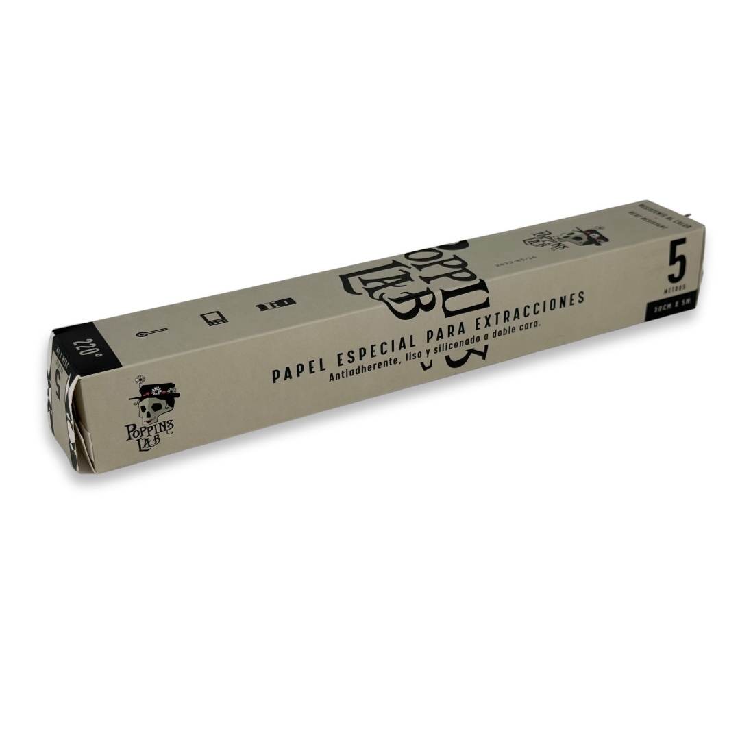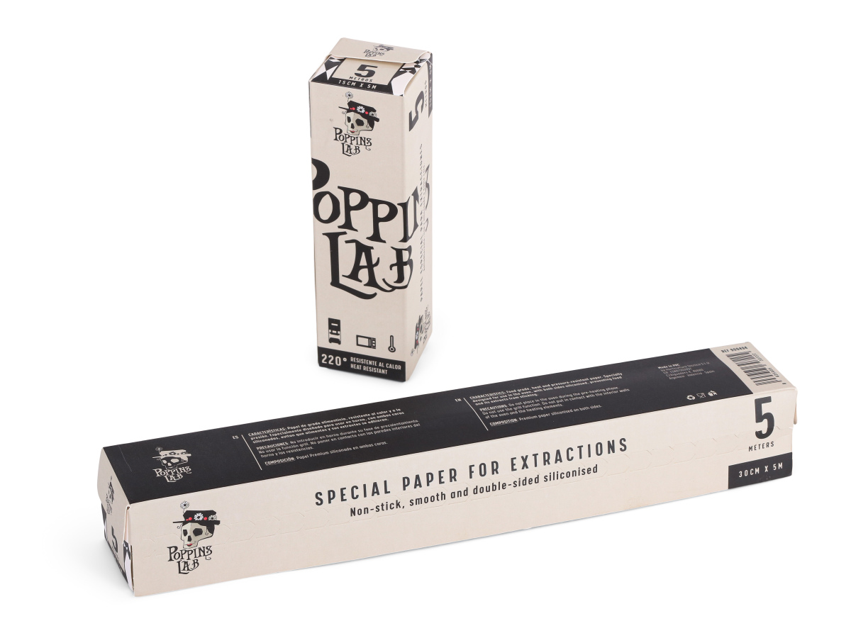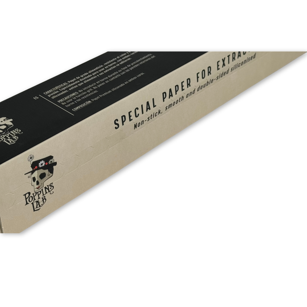 Poppins Lab pone a tu disposición un papel excepcional que soporta las elevadas temperaturas derivadas de las extracciones de Rosin Tech. El papel está revestido de silicona de grado alimentario por ambas caras, de manera que la resina no queda pegada al papel y el proceso resulta más higiénico.